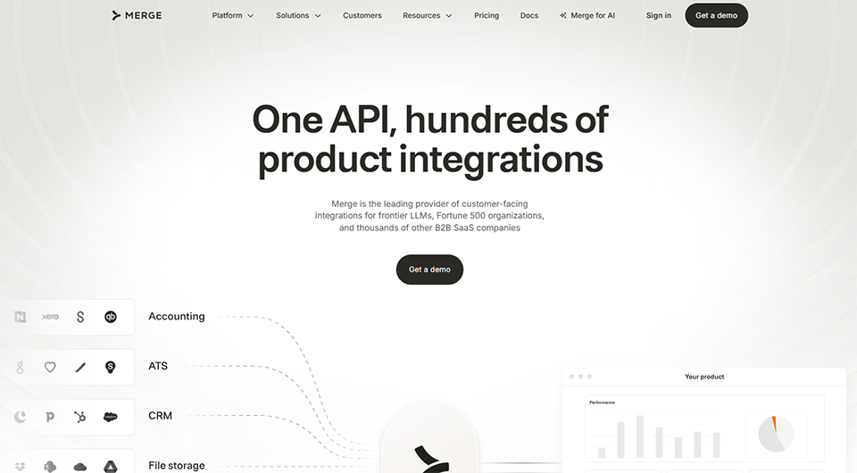 One API, hundreds of product integrations: Merge is a single platform to add entire categories of integrations into your product, powering the deepest use cases possible.