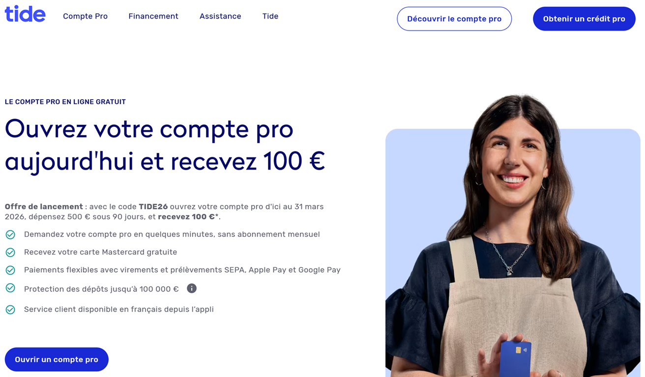 Tide est une plateforme de gestion financière innovante pensée pour les professionnels, offrant un compte pro en ligne facile à ouvrir, sans abonnement mensuel, avec une carte Mastercard gratuite, des paiements SEPA, Apple Pay et Google Pay, et une protection des dépôts jusqu’à 100 000 €. Elle permet aux freelances, micro-entreprises et petites entreprises de envoyer et recevoir des paiements, suivre leur trésorerie en temps réel, automatiser leurs virements et prélèvements, et gérer leurs dépenses directement depuis l’application mobile ou web.