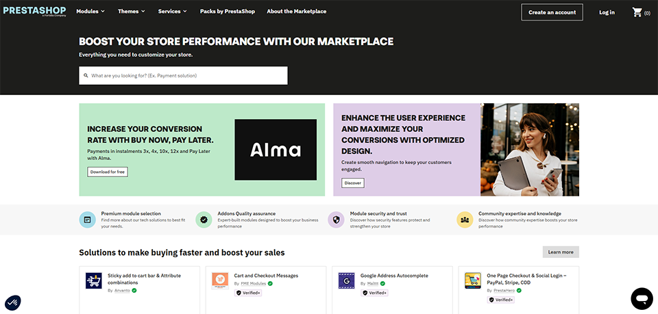 Les marchands PrestaShop peuvent y trouver de nombreux modules créés en partenariat avec les acteurs majeurs du numérique et du e-commerce, afin d'ajouter des fonctionnalités à leurs boutiques.